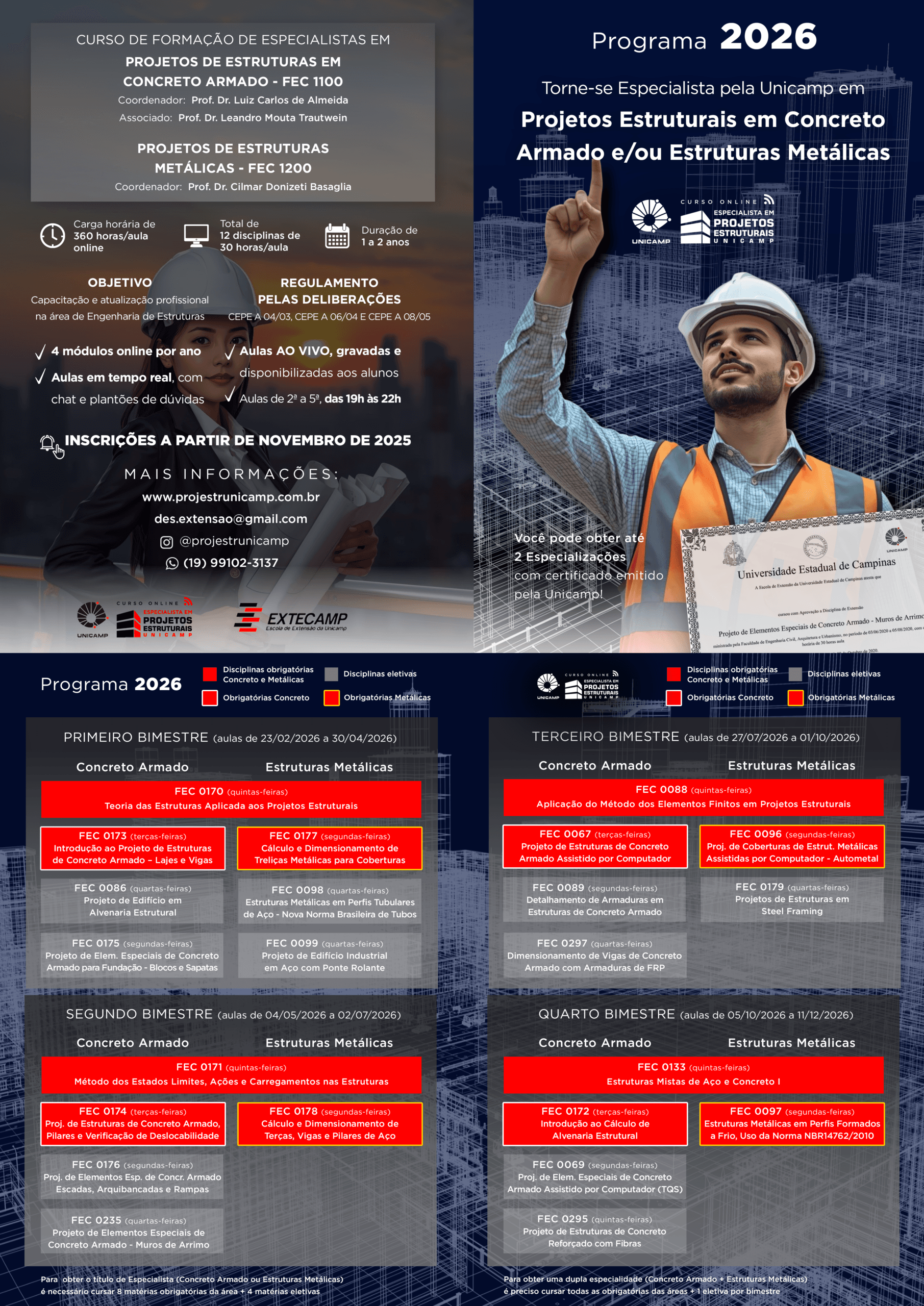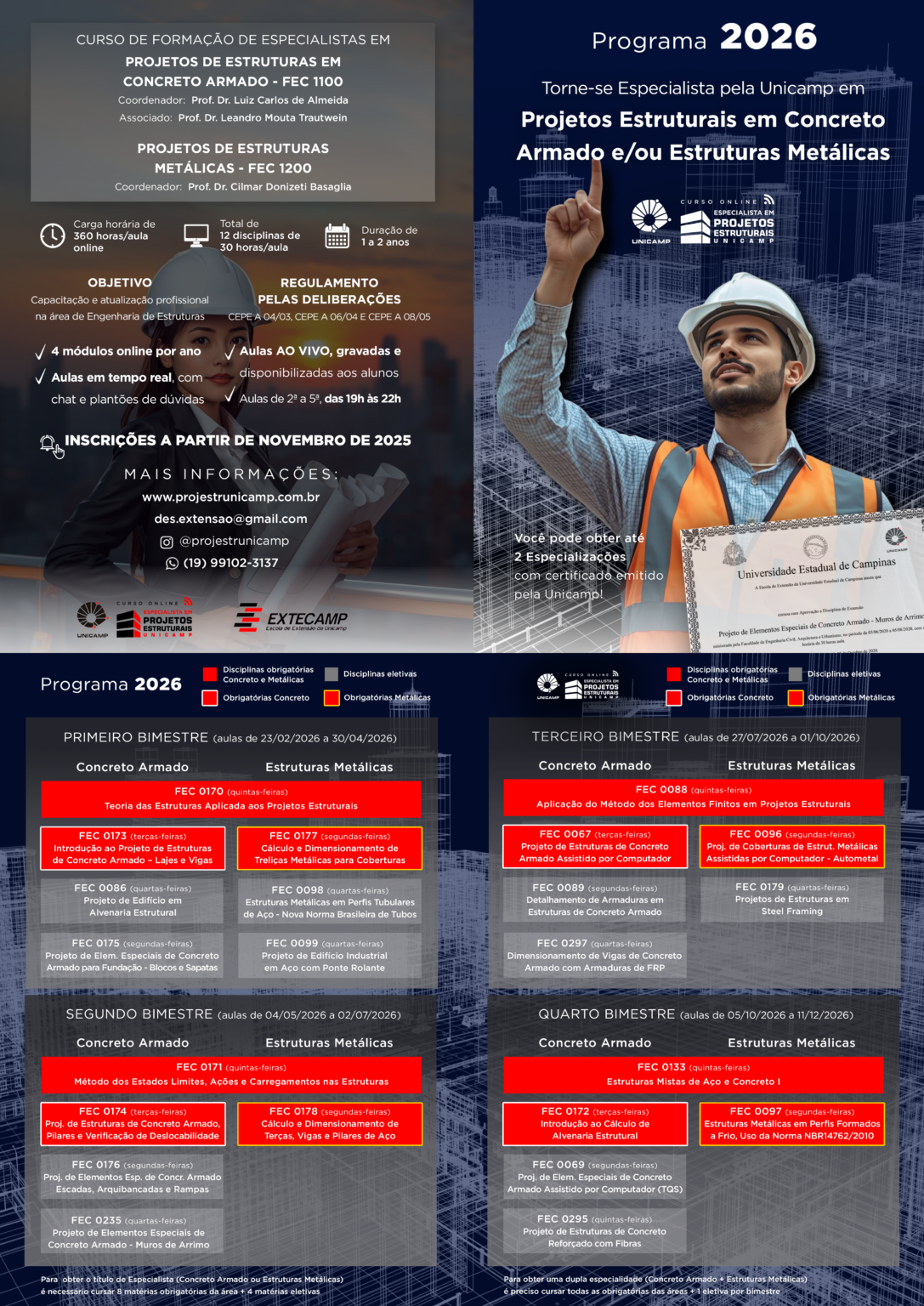 É possível optar por uma especialidade (Concreto Armado ou Estruturas Metálicas) ou por ambas. Para isso, o(a) aluno(a) precisa cursar as seguintes MATÉRIAS OBRIGATÓRIAS E ELETIVAS a serem escolhidas na grade de cada bimestre: